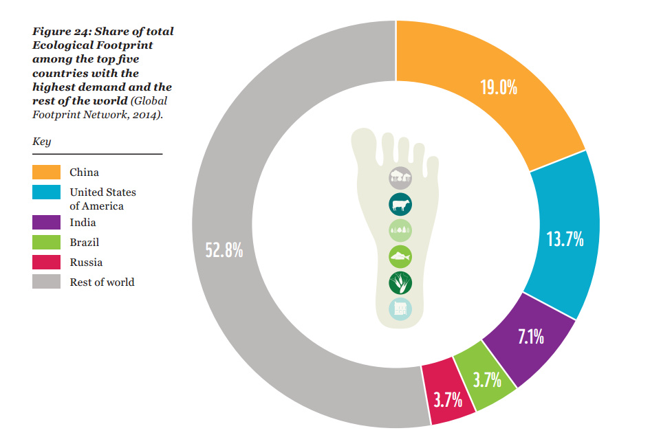 In 1970, one planet was exactly enough for the whole world population. In just 40 years, our demands have risen 50% - we now need 1.5 Earths to sustain our way of life, given the current world population. China has the largest impact, accounting for 19% of the world’s ecological footprint, followed by USA (14%), India (7%), Brazil (4%) and Russia (4%).