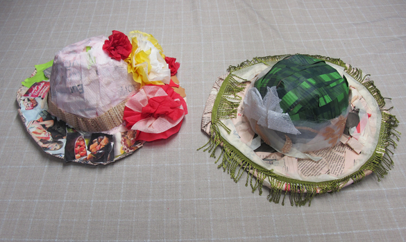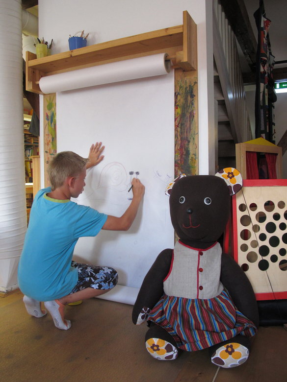 In the play and workshop rooms paper is a commonplace raw material for creating new toys or just playing around with. The discarded newspaper reels are hung on the wall and once drawings cover the hanging paper, they are rolled down to reveal new fresh paper. The finished paper is then used alongside discarded newsprint for creating other items such as pretty hats. Reusing reused paper - heading in the right direction!